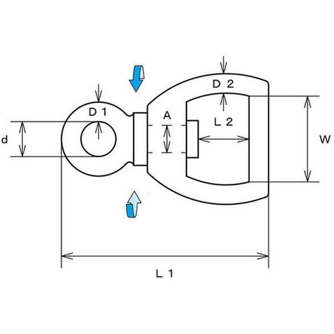 ・使用荷重(kN):0.59・D1(mm):5・D2(mm):5・L1(mm):53・L2(mm):13・A(mm):7・W(mm):22・d(mm):9