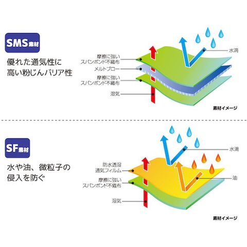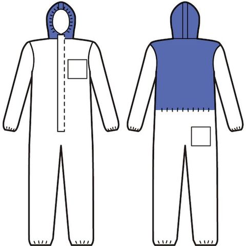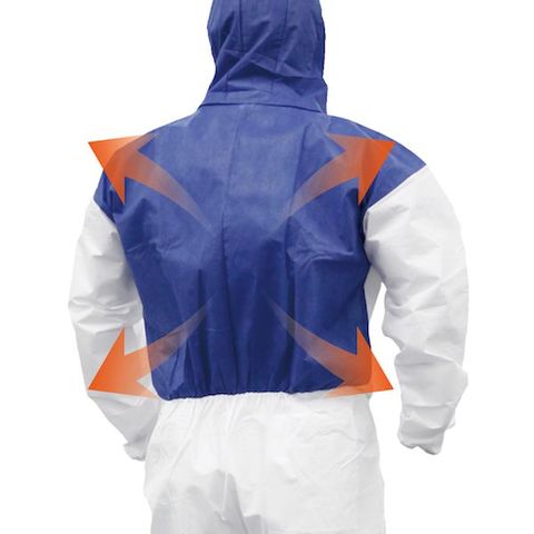 ・高いバリアー性能を持つ生地+通気性の高い生地を組み合わせたハイブリッド防護服。・バリアー性能が高い生地ほどそれに比例して使用時の通気性が下がり、使用者は蒸し暑く感じます。・フード部および背面にのみ通気性の高い生地を採用することで作業時の快適性を高めています。