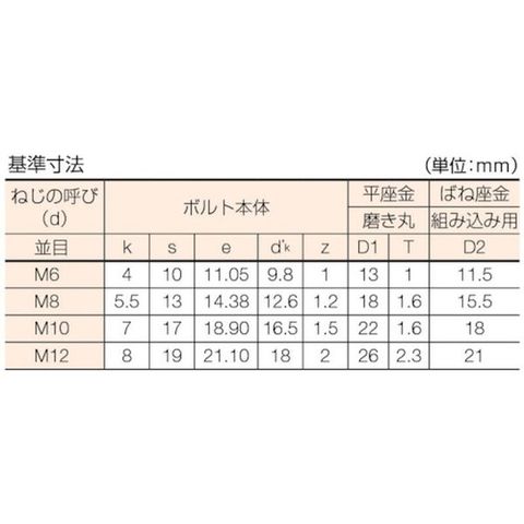 ・寸法(mm)d:M12・寸法(mm)L:20・ねじピッチ(mm):1.75・ねじ部長さ(mm):20・ばね座金外径(mm):20.5・ばね座金厚さ(mm):3・平座金外径(mm):26・強度区分:4.8