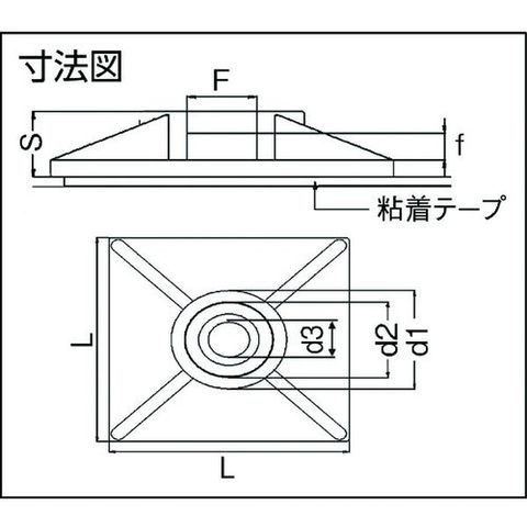 ・色:白・縦(mm):19・横(mm):19・使用結束バンド幅(mm):~4・最大結束径(mm):使用結束バンドによる・固定方法:粘着テープ・下穴径(mm):4.75・F(mm):4.3・d1(mm):10.3・d2(mm):8.4・d3(mm):4.75・L(mm):19・S(mm):4.5・f(mm):2.1