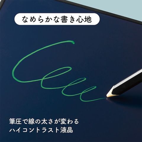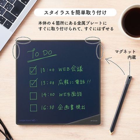 ・紙に書くような、なめらかな書き心地で、スイスイ書いて、パッと消せる電子メモパットです。・電源ONの操作が必要なく、いつでもすぐに書き始められます。・マグネットを使用した貼り付けや市販のねじを使用した壁掛けに対応したインテリア向け大画面モデルです。・スタイラス上部を本体右下の消去スペースに近づけるだけで画面を消去することができます。・大画面でなめらかな書き心地、消去も簡単です。・紙に書くような、なめらかな書き心地の電子メモパットです。・筆圧で線の太さが変わるハイコントラスト液晶を採用しており、画面サイズは約11.3インチ(約203×203mm)です。・スタイラス上部を本体右下の消去スペースに近づけるだけで消去することが可能です。・付け外し簡単なスタイラスです。・スタイラス上部に内蔵されているマグネットを、本体側面の4 箇所にある金属プレートに取り付けることができます。