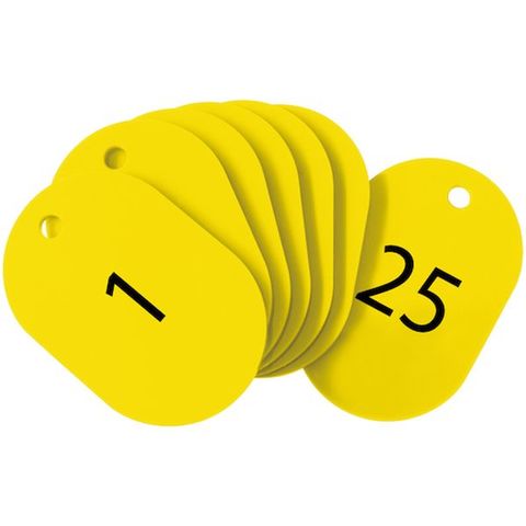 ・色:黄・内容:1~25番・縦(mm):46・横(mm):31・厚さ(mm):2.5・穴径(mm):4