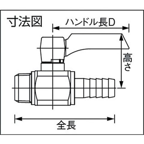 ・全長(mm):72.5・高さ(mm):40・ハンドル長D(mm):55・最高許容圧力(MPa):0.98・使用温度範囲(℃):-10~80・タケノコ外径(mm):14・A寸法:R1/2