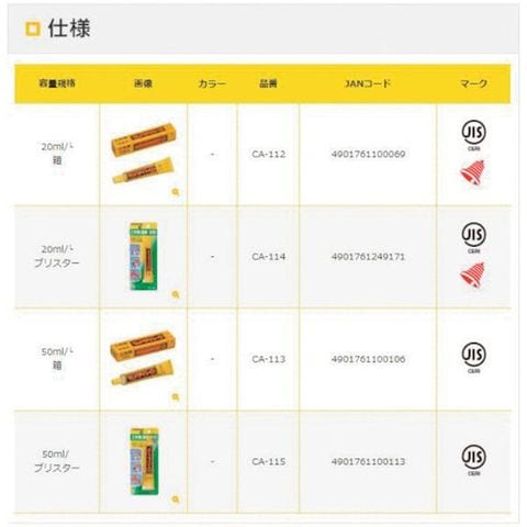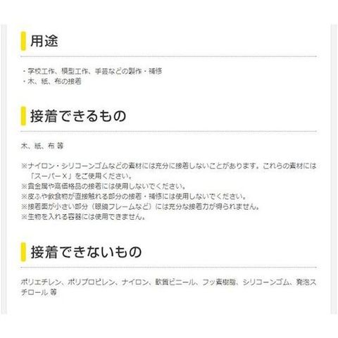 ・貴金属や高価格品の接着には使用しないでください。・皮ふや飲食物が直接触れる部分の接着・補修には使用しないでください。・接着面が小さい部分(眼鏡フレームなど)には充分な接着力が得られません。・生物を入れる容器には使用できません。