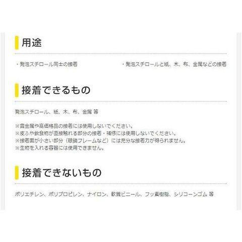 ・発泡スチロール同士の接着に。・発泡スチロールと紙、木、布、金属などの接着に。