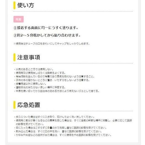 ・ポリエチレン、ポリプロピレン、ナイロン、軟質ビニール、フッ素樹脂、シリコーンゴム 等は接着できません。