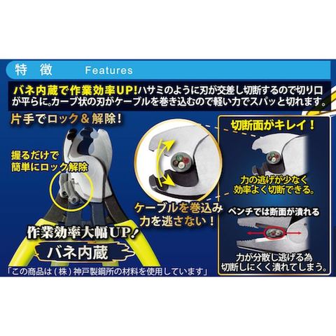 ・ケーブル(VCT、IV線など)や、より線を軽い力でキレイに切れます。・CA--22・22S・38・60は先端に切断刃があり、細線の切断被覆剥きに便利です。・CA-22Sはバネ内蔵で連続作業の負担を軽減します。