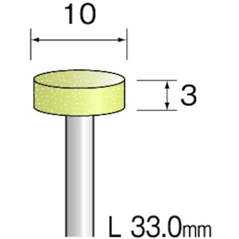 ・粒度(#):120・形状:円柱横長・外径(mm):10・幅(mm):3・軸径(mm):3.0・最高使用回転数(rpm):60000・砥粒:WA・全長(mm):33.0・粒度:WA#120