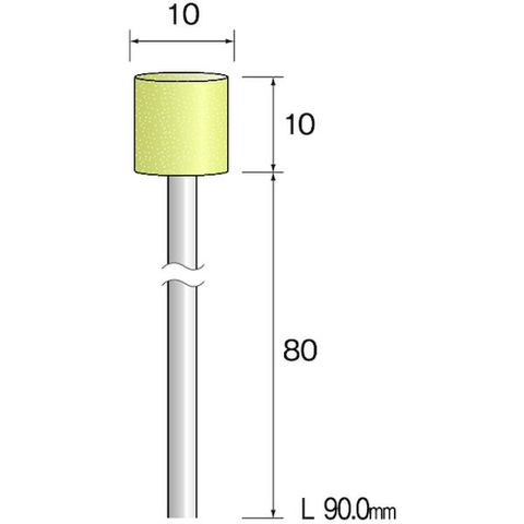 ・粒度(#):120・形状:円柱・外径(mm):10・幅(mm):10・軸径(mm):3.0・最高使用回転数(rpm):4500・砥粒:WA・全長(mm):90.0・粒度:WA#120