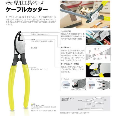 ・ケーブル(VCT、IV線など)や、より線を軽い力でキレイに切れます。・CA--22・22S・38・60は先端に切断刃があり、細線の切断被覆剥きに便利です。