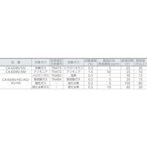・対象ガス:アンモニア・適合機種:GM164、GM164-1・国家検定区分:直結式・国家検定合格番号:TN472・破過時間(分):25・規格値(分以上):10・試験ガス:アンモニア・試験濃度(%):1.0・最高許容透過濃度(ppm):50