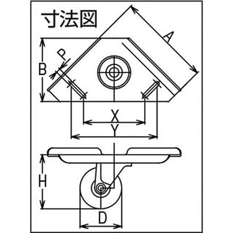 ・車輪径D(mm):50・タイプ:自在式・許容荷重(daN):34・許容荷重(kgf):35・車輪幅(mm):20・取付高H(mm):66・取付座A(mm):113・取付座B(mm):76・取付ピッチX(mm):73.5・取付ピッチY(mm):103.5・取付穴径P(mm):5.3