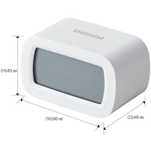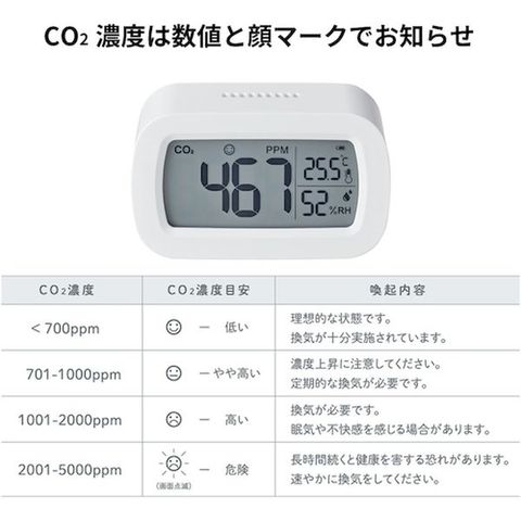 ・室内の[[CO2]]濃度を数値化して、人の密集や空気のよどみをお知らせする卓上[[CO2]]モニターです。・感染症予防や室内環境整備におススメです。・室内の[[CO2]]濃度、温度、室温を数値化します。・[[CO2]]濃度の表示は大きく、温度と湿度も表示されることで室内の環境が一目でわかるように設計されています。・また4段階の顔表示でCO2濃度の目安を表示することでご利用者様へ室内の喚起のタイミングをお知らせします。・インテリアに馴染みやすいシンプルデザインです。・本体の大きさは約横9cm高さ5cmで手のひらに乗るほどコンパクトです。・本体色は白で、四隅は丸く、卓上においても違和感を感じないデザイン設計となっています。・また、液晶は大きく表示することで見やすい仕様となっています。