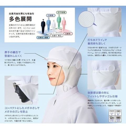 ・レギュラーポリエステルや綿よりも、素早く汗を吸い上げて、即座に拡散・乾燥します。・ベタつきを抑え、ドライでさわやかな着用感が持続します。・汗をかきやすい首回りにはスポーツウエアにも使われる「打ち水ドライ[[R上]]」のメッシュを使用し、給水速乾性に優れ、汗冷えを抑制します。・メガネさし、マスク掛け、前部止めスナッボタン、後部周りゴム入りです。