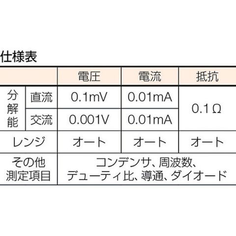 ・直流電圧(V):600・交流電圧(V):600・直流電流(A):0.4・交流電流(A):0.4・抵抗(Ω):40M・直流電流(mA):400・交流電流(mA):400・検波方式:平均値整流(MEAN)・導通チェック:10Ω~120Ω以下でブザー音 開放電圧:約0.4V・校正書類:対応可能・電源(V):単3乾電池(R6)×2本(モニタ電池付属)・幅(mm):104・奥行(mm):46・高さ(mm):176・電源:単3乾電池(R6P)×2本(付属)・連続使用時間(h):約500時間・最大表示(カウント):4000・コンデンサ容量(F):100μ・周波数(Hz):100k・デューティ比:20~80%・ダイオードテスト:開放電圧1.5V