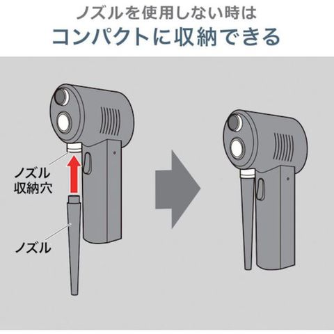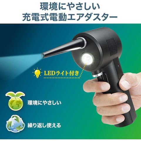 ・繰り返し使える充電式電動エアダスターです。・本体はどの向きでも使用可能で、逆さにも対応しています。・付属のノズルは狭い箇所での使用に最適で、使用後は収納も可能です。・使いたい時に何度でも、コストを気にすることなく、手軽にお掃除できます。・噴射ボタンを[[1]]回連続で押すと、連続噴射できます。・もう一度押すと停止します。・通常のエアダスターに比べ、繰り返しの購入がなく、空き缶の処理、ガスの匂い、火気による危険がありません。