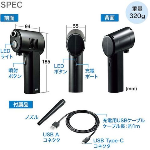 ・使用可能時間:20分・ノズル長さ:105mm・モーター出力:40W・風圧:27~32g・充電時間:2.5時間(USB充電ケーブル2A使用時)