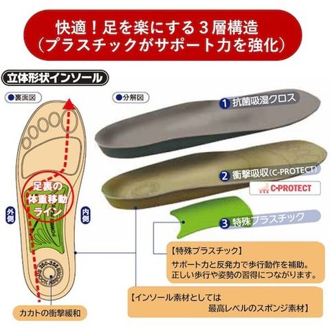 ・プラスチックの反発力とバランスのとれたアーチ形状で、歩行や立ち仕事に威力を発揮します。・反発弾性スポンジは衝撃吸収効果が高く、へたりにも強いため、長期間、膝と腰へのダメージを緩和します。・1cm刻みのサイズでフィット感を向上、カットせずに使用できる便利なインソールです。・仕事でよく歩く方に、長時間の立ち仕事に最適です。・トレッキングやスポーツにも使用できます。
