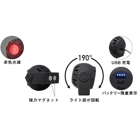 ・ライト部が上下190度回転し、赤色点滅機能付で用途の幅が広がります。・強力マグネットで簡単に固定できます。・バッテリー残量表示機能付です。