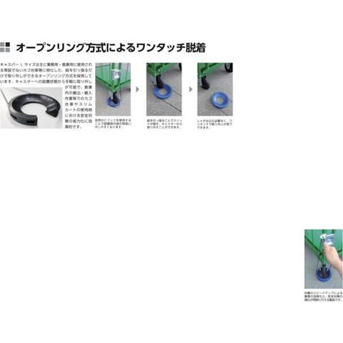 ・極薄スリット式により、安全性の高さと着脱の手軽さの両立を実現した台車用キャスターストッパーです。・オープンリング方式によるワンタッチ脱着が可能です。