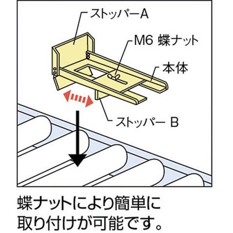 ・取り付け簡単、調整は蝶ナットでワンタッチです。・ローラーを挟み込む構造であるため、小型でも外れる心配がありません。・わずか1種類で、標準タイプのローラーコンベヤに対応します。