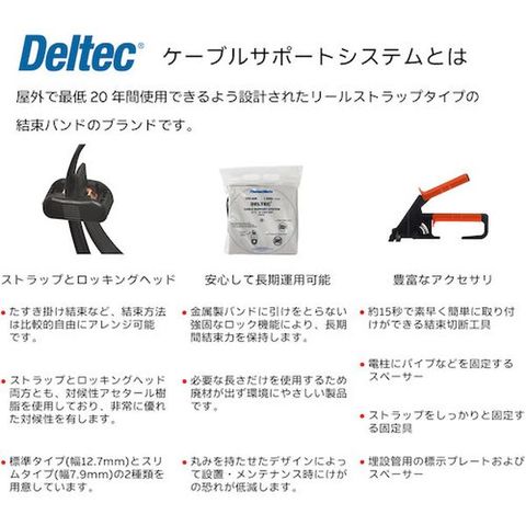 ・Deltec(デルテック)は、屋外で最低20年間使用できるように設計されたリールストラップタイプの結束バンド(ケーブルタイ)です。・量産用途に最適な343mmのリールストラック100本とロッキングヘッド25個のセット商品(標準タイプ)