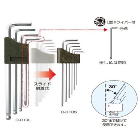 ・ロングボールポイント六角レンチ9本組セットにL型ドライバーが付いた特殊10本組セット