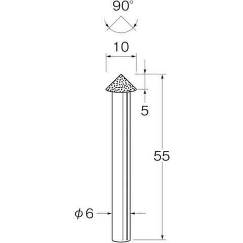 ・粒度(#):200・刃径(mm):10・刃長(mm):5・軸径(mm):6・全長(mm):55・最高使用回転数(rpm):67000