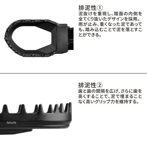 マッドコンディションでのグリップ力にこだわった、排泥性重視のワイドフットペグ。中央部を大胆にくり抜き、できる限りの泥抜け性能を持たせつつ、簡単には曲がらない強度を確保。プロライダーの走行テストを重ねて強度バランスを調整。前後60mmの広いペグ幅により、スタンディング時の安定性が増すことで、よりアグレッシブなライディングをサポートする。
