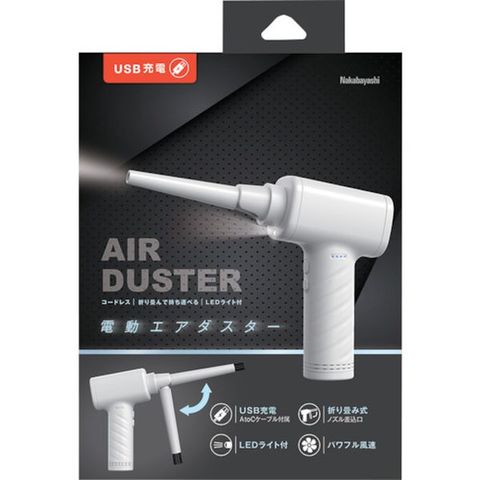 ・空気をパワフルに噴射する電動のエアダスターです。・折りたたみ式でコンパクト・取り回しも楽に行えます。・ノズル差込口が90度折りたたみ可能です。・LEDライト付きで暗所のホコリも見つけやすいです。
