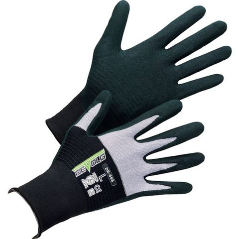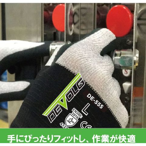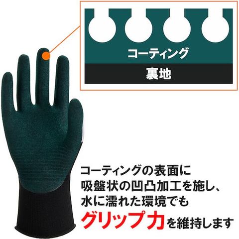 ・特殊素材による快適な着け心地、ニトリルゴムコーティングによるグリップ力、耐摩耗性を実現しました。・手の甲部分にマイクロファイバーなど2種類の繊維素材を組み合わせ、通気性の良さとフィット感があります。・特殊すべり止め加工も施してあるので、水や油が付着しても、グリップ力を維持します。