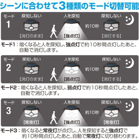 ・センサーが人を感知して自動的に明かりを灯します。・ソーラーなのでコンセント不要、電気代0円です。・木壁やコンクリート壁にネジで取付け、フェンスに結束バンドで取り付けなどが可能です。