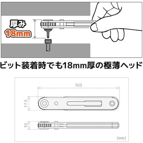 ・ラチェット機能付きの極薄オフセットドライバー。・先端極薄11mmで狭い場所での作業に便利。・付属ビット装着時でも厚み18mm。・M6のキャップボルトにも使える高トルク設計。・早回し機構付きで作業能率が向上。・全長18mm+No.2とー6×0.8mmのビット付属。・付属ビットは本体に収納できます。