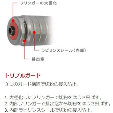 ・ボディサイズを極限までスリム化しストレート部を長くしたアタッチメントです。・ロータリー スリムタイプ(DSM32)を更に延長した、クラス最長のアタッチメントです。・遠心力を利用して切粉を排除するトリプルガード構造で優れた防じん機能を実現します。・先端に装着したコレットチャックを交換することで、軸径φ1.0~φ3.175までの軸付先端工具が使用可能です。・軸付先端工具はスパナ締めで確実にチャッキングします。・クイックチェンジ機能を搭載しアタッチメントとモータをスピード交換することができます。・深穴・細穴・狭所の面取り、バリ取り、磨きの作業効率がアップします。