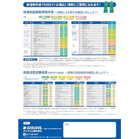 ・溶剤・薬品によってい耐透過耐久性に強弱があります。別途お問い合わせください。・手袋の使用方法や環境などにより耐透過性は変化します。・同一溶剤であっても手袋の使用方法・時間により手袋が変化する場合がありますので、注意してご使用ください。
