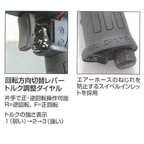 ●使用コンプレッサー:2.2kwエアーホースのねじれを防止するスイベルインレットを採用