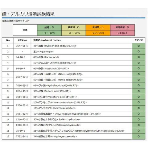 ●多種の酸・アルカリ、王水、20%アンモニア水でもご使用いただけます。