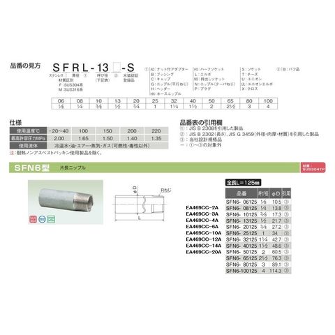 EA469CC-2A エスコ ESCO R 1/4"x125mm 片ねじニップル(ステンレス製)