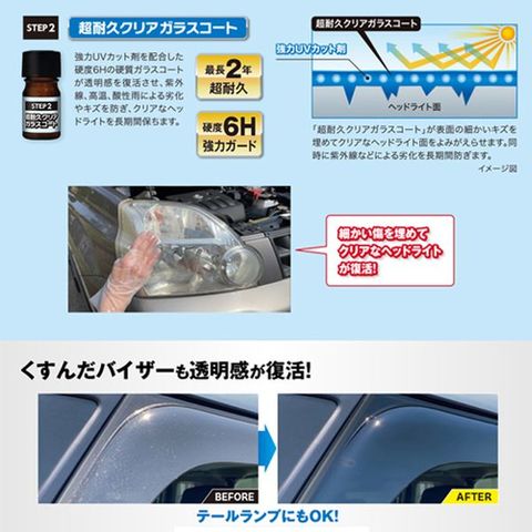 硬度6Hの硬質ガラスコートが透明感を復活させ、ヘッドライトをキズや劣化から保護します。