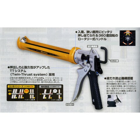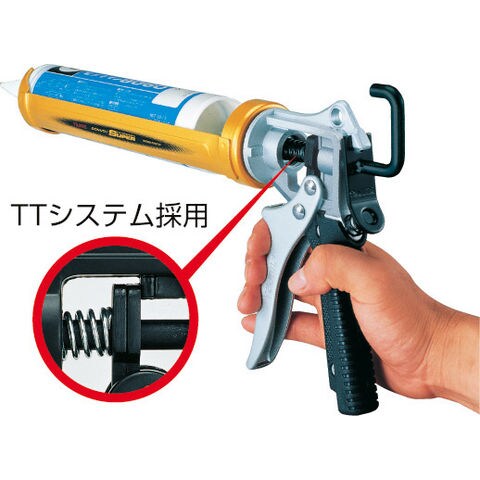 2枚の送り機構板を採用したTTシステムにより、硬いコーキング材もしっかりなめらかに吐出できます。