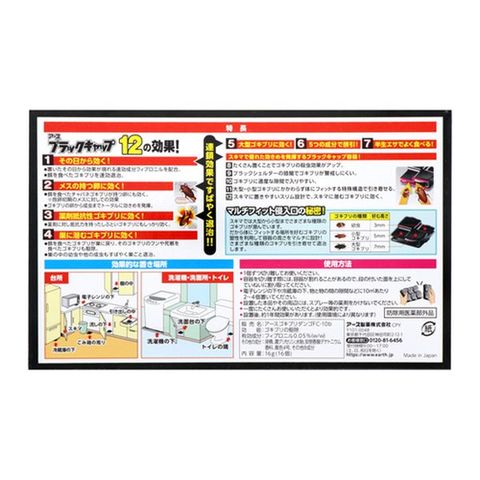 <アースブラックキャップ12の効果> 1)その日から効く! 置いたその日から効果が現れる速効成分フィプロニルを配合。 餌を食べたゴキブリを速効退治。 2)メスの持つ卵に効く! 餌を食べたチャバネゴキブリが持つ卵にも効く。※抱卵初期のメスに対しての効果 ゴキブリの卵から成虫までトータルに効きめを発揮。 3)薬剤抵抗性ゴキブリに効く! 薬剤に対し抵抗力を持ったしぶといゴキブリにもしっかり効く。 4)巣に潜むゴキブリに効く! 餌を食べたゴキブリが巣に戻り、そのゴキブリのフンや死骸を食べたゴキブリも駆除。 巣の中の幼虫や他の成虫もすばやく巣ごと退治。 5)大型ゴキブリに効く! 6)5つの成分で誘引! 7)半生エサでよく食べる! 8)たくさん置くことでゴキブリの殺虫効果がアップ。 9)ブラックシェルターの暗闇でゴキブリが警戒しにくい。 10)ゴキブリに適度な隙間で入りやすい。 11)大型・小型ゴキブリにかかわらず体にフィットする特殊構造で引き寄せる。 12)スキマに置きやすいスリム設計で、隙間に潜むゴキブリに効く。