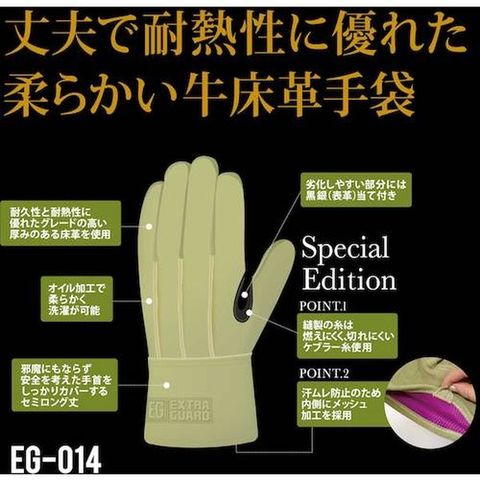 ・耐摩耗性、耐熱性に優れた柔らかい牛床革手袋です。・耐久性と耐熱性に優れたグレードの高い厚みのある床革を使用しています。・ニオイや汗ムレを防止する内側メッシュ加工の仕様です。・オイル加工で柔らかく洗濯が可能です。・劣化しやすい親指又部分には黒銀(表革)の当てを付けています。・燃えにくく、耐切創性のあるケブラー糸で縫製しています。・手首をしっかりカバーするセミロング丈になっています。