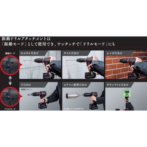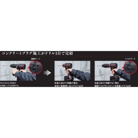 ・ワンタッチ接続・振動モード・ドリルモードの2種類搭載・コンクリートプラグ施工がドリル1台で完結・モルタル、レンガ、タイルまで穴あけ可能