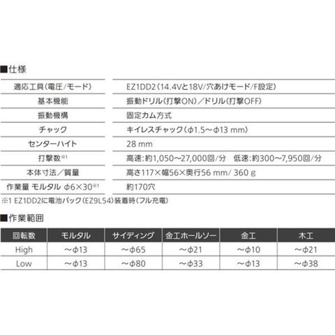 ・本体寸法(mm):117・差込角(mm):Φ13・色:黒・適合機種:EZ1DD2・品名:振動ドリルアタッチメント・打撃数(min[[の-1乗]]):27000・無負荷回転速度(min[[の-1乗]]):1,800・チャック能力(mm):Φ1.5~13・全長(mm):117