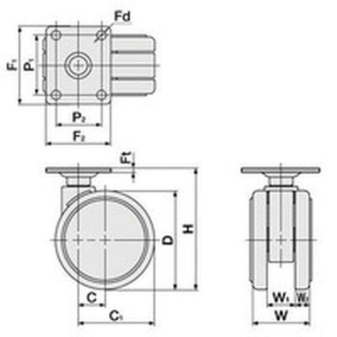 ・車輪径D(mm):75・タイプ:自在式(ダブルストッパー付)・許容荷重(daN):78.4・許容荷重(kgf):80・車輪幅(mm):47・取付高H(mm):92・取付座A(mm):60・取付座B(mm):50・取付ピッチX(mm):46・取付ピッチY(mm):35・取付穴径P(mm):6.4