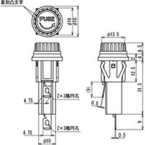 ・絶縁抵抗:DC500V、100MΩ以上・耐電圧:AC2000V(1分間)・適合ヒューズ管:6.4×30/6.35×30/6.35×31.8mm・はんだ付け兼用187タブ端子(t0.5)