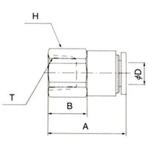 ・適合チューブ外径D(mm):4・接続口径:Rc1/8・六角対辺(mm):12・使用圧力:1MPa(空気)、0.3MPa(水)・使用流体:空気、水・流体温度(℃):-5~60℃(空気)、5~40℃(水)