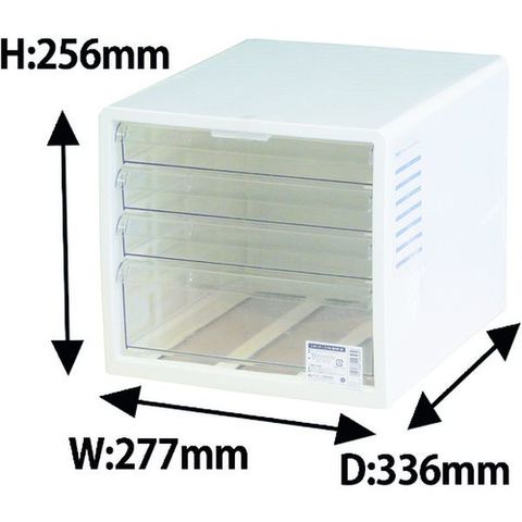 ・最大積載量(kg/台):4・均等積載量(kg/段):1・間口(mm):277・奥行(mm):336・高さ(mm):256・段数(段):4・色:ホワイト・本体色:ホワイト・引出し色:クリア・タイプ:文具収納