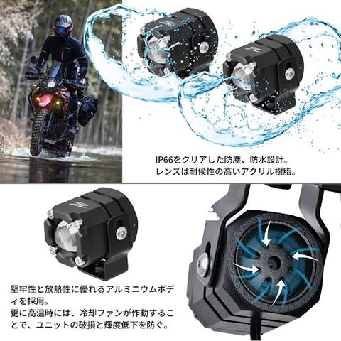 暗い夜道や山間部でヘッドライトの明るさを補い、路肩や見通しの悪い曲がり口などをワイドに照らす、LEDプロジェクター フォグライト。十分な明るさを保持しながら、バッテリーへの負担を考慮した消費電力15Wx2個。車種専用設計によりボルトオン装着。冷却システム、ハイビーム、ロービーム切換え、防塵防水仕様などコンパクトなユニットに凝縮した機能を備える。