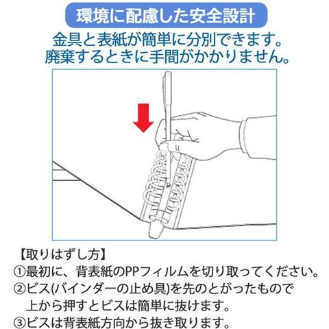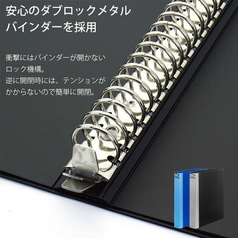 ・リングをがっちりロックするダブロック機構と、水をはじく丈夫なPPくるみ表紙で大切な書類を長期間保存するのに適しています。・環境に配慮した安全設計になっており、表紙は焼却時に有毒ガスを発生しません。・金具と表紙が簡単に分別できます。・廃棄するときに手間がかかりません。